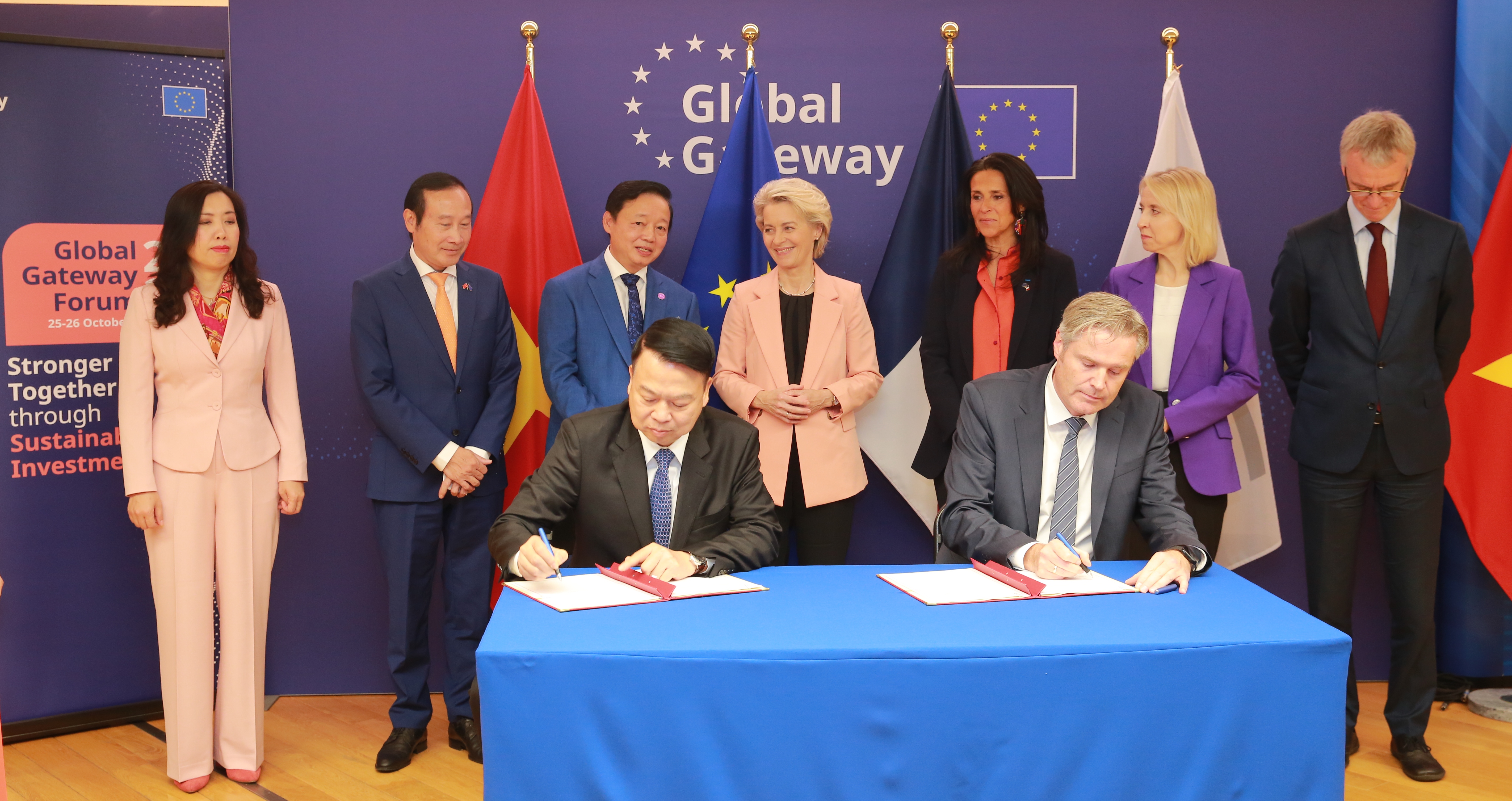 Chủ tịch EC Ursula von der Leyen khẳng định Việt Nam là đối tác quan trọng của EC trong việc triển khai các chiến lược, sáng kiến hợp tác với khu vực, đánh giá cao Việt Nam cử đoàn đại biểu cấp cao tham dự Diễn đàn, hoan nghênh hợp tác chặt chẽ trong lĩnh vực ứng phó với biến đổi khí hậu giữa hai bên, nhất là việc triển khai khuôn khổ Đối tác chuyển đổi năng lượng công bằng (JETP). Bà Ursula von der Leyen nhấn mạnh Việt Nam là ví dụ tuyệt vời về hợp tác với EU, cảm ơn về những nỗ lực của Việt Nam trong thực hiện các khuyến nghị của EC về IUU, hy vọng sẽ sớm giải quyết vấn đề này trong thời gian tới. Trong triển khai Chiến lược Cửa ngõ toàn cầu, Chủ tịch EC khẳng định sẽ tiếp tục ưu tiên hợp tác trong các lĩnh vực năng lượng tái tạo, chuyển đổi số, tăng trưởng xanh với Việt Nam.