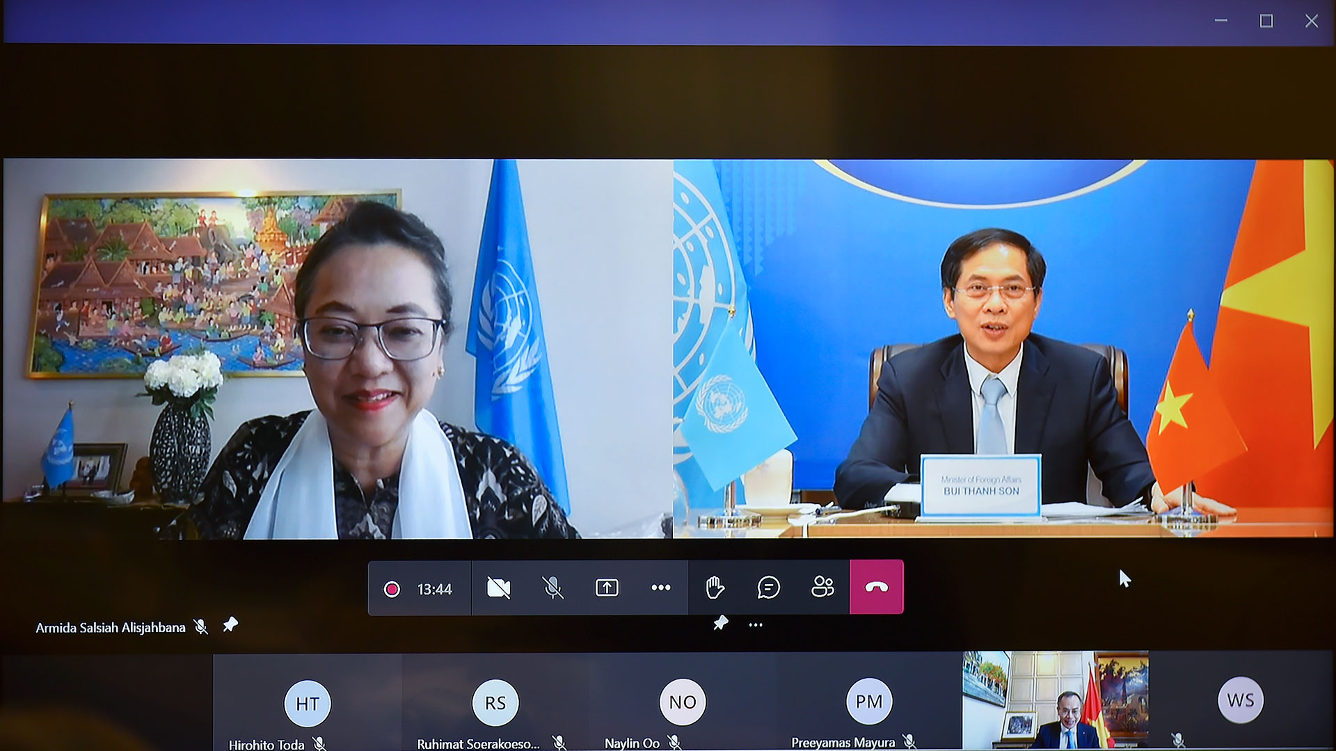 Chiều ngày 13/8/2021, Bộ trưởng Ngoại giao Bùi Thanh Sơn đã hội đàm trực tuyến với Bà Armida Salsiah Alisjahbana, Phó Tổng thư ký Liên hợp quốc kiêm Thư ký điều hành Uỷ ban Kinh tế-xã hội khu vực châu Á-Thái Bình Dương của LHQ (ESCAP).
