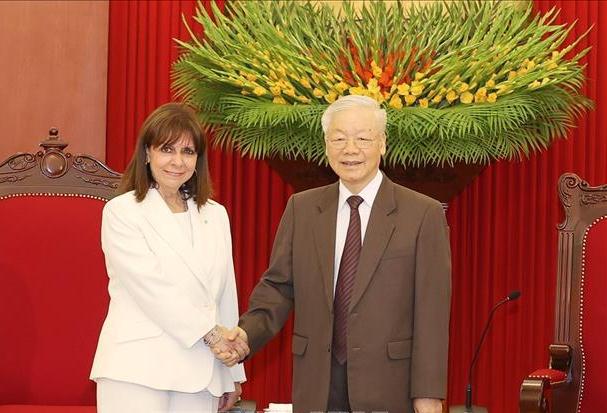 Nhân dịp này, Tổng Bí thư cũng trao đổi với Tổng thống Hy Lạp về những thành tựu đổi mới, mục tiêu phát triển của Việt Nam đến giữa thế kỷ XXI, những kết quả tích cực đạt được trong việc phòng chống dịch bệnh Covid-19, bảo đảm an sinh xã hội, phục hồi và phát triển kinh tế và đường lối đối ngoại độc lập, tự chủ, hoà bình, hữu nghị, hợp tác và phát triển; đa phương hoá, đa dạng hoá quan hệ; Việt Nam là bạn, đối tác tin cậy, thành viên có trách nhiệm của cộng đồng quốc tế, chủ động, tích cực hội nhập quốc tế.