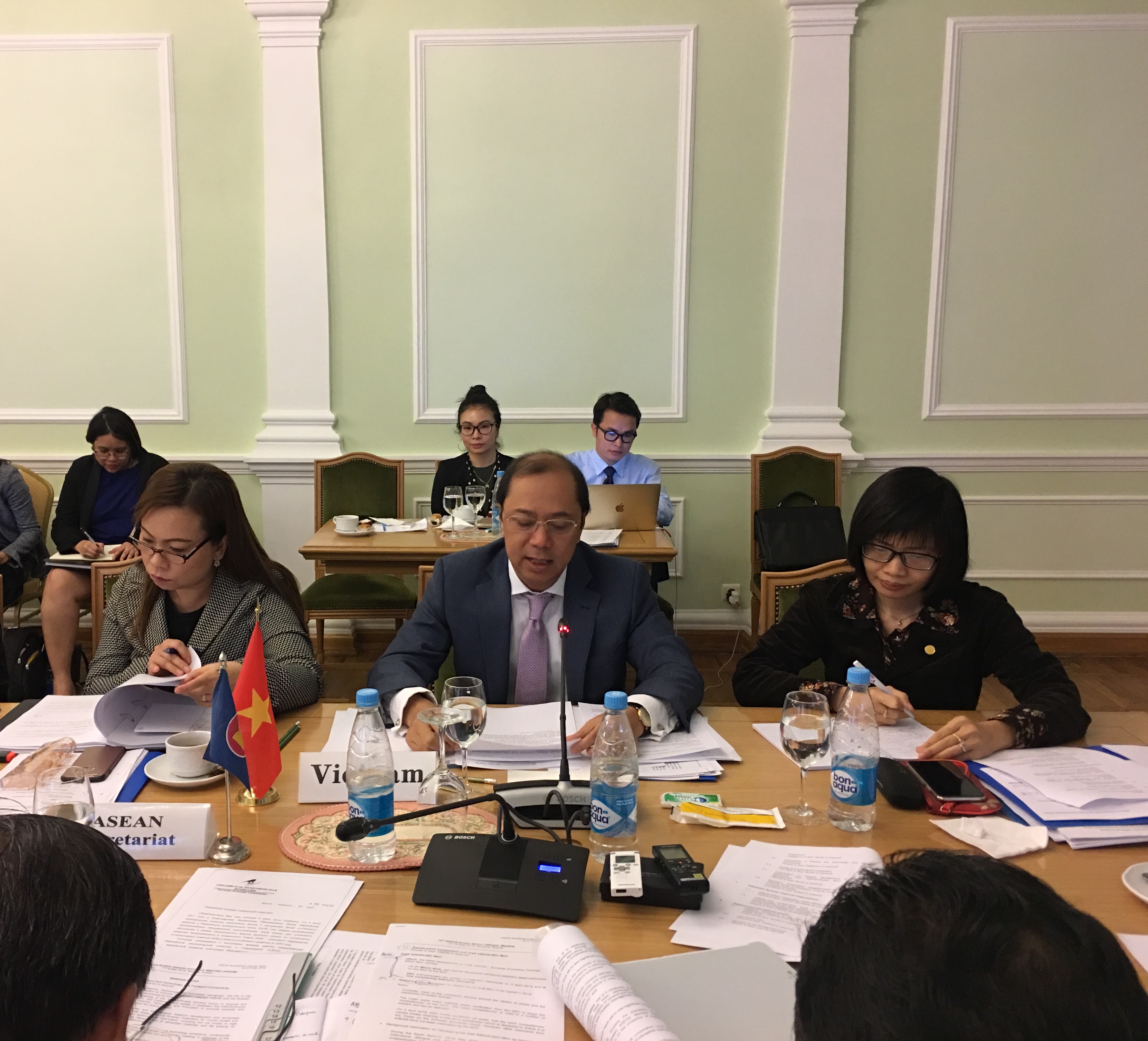 Phát biểu tại cuộc họp, Thứ trưởng Nguyễn Quốc Dũng khẳng định Việt Nam coi trọng và nỗ lực thúc đẩy quan hệ hợp tác ASEAN-Nga phát triển thực chất, hiệu quả; đánh giá cao vai trò và đóng góp của Nga ở khu vực. Thay mặt các nước ASEAN trình bày về hợp tác năng lượng và nông nghiệp, Thứ trưởng khẳng định đây là những lĩnh vực mà ASEAN và Nga cùng quan tâm và có nhiều tiềm năng hợp tác. Với thế mạnh về công nghệ, Nga có thể tăng cường hợp tác với ASEAN trên các lĩnh vực như dầu khí, điện, năng lượng nguyên tử dân sự và năng lượng tái tạo, an ninh năng lượng v.v. Về nông nghiệp, ASEAN và Nga cần tạo điều kiện thuận lợi cho việc xuất khẩu các mặt hàng nông sản mà mỗi bên có lợi thế như các sản phẩm thịt, bơ, sữa và trái cây vùng ôn đới của Nga và các mặt hàng hoa quả nhiệt đới, các loại hạt, chè, cà phê của ASEAN. Thứ trưởng gợi mở hướng tăng cường đầu tư của các doanh nghiệp ASEAN vào lĩnh vực nông nghiệp chế biến tại Nga từ thành công của Công ty TH True Milk của Việt Nam và Công ty CP Foods của Thái Lan.