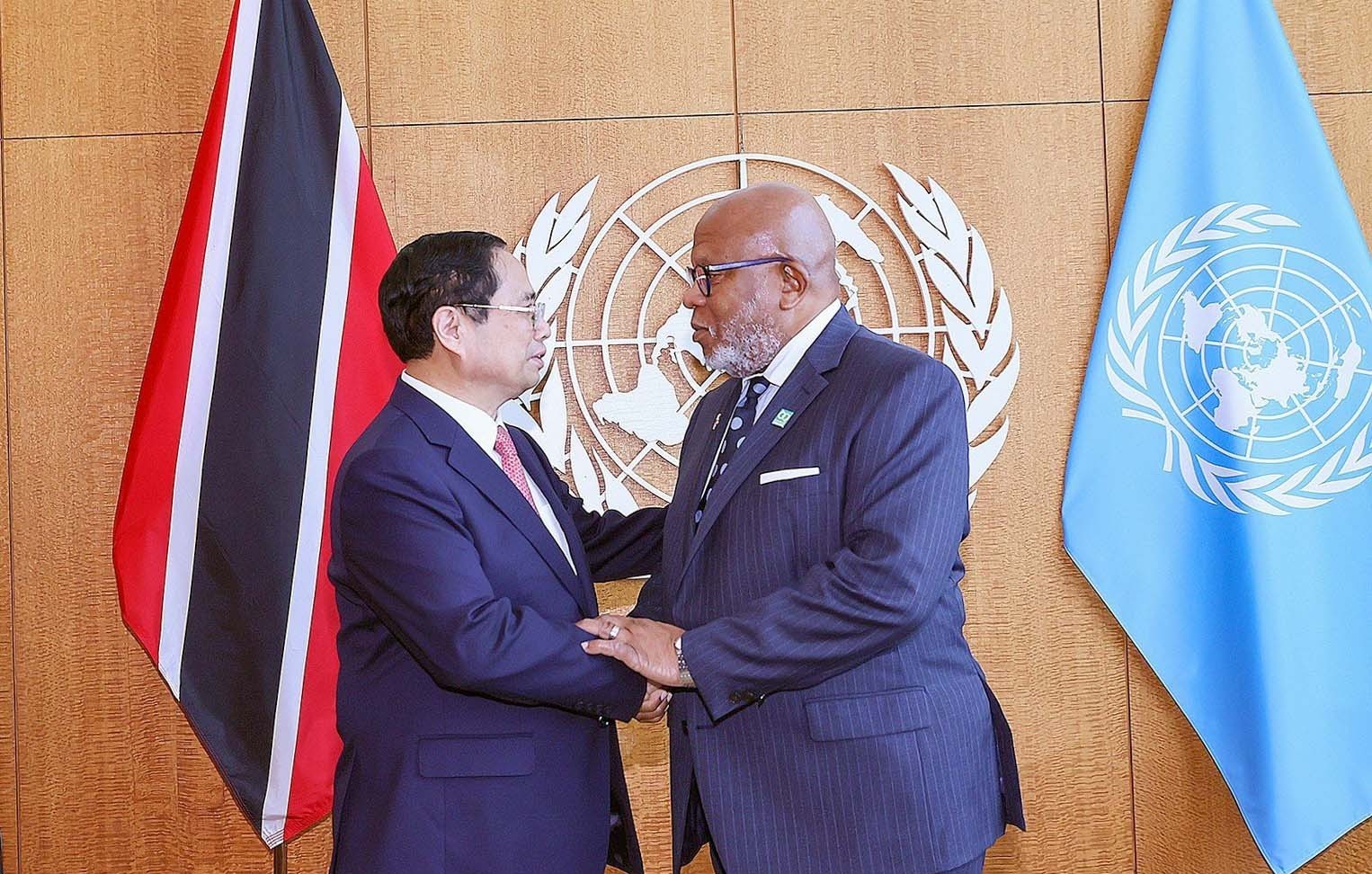 | Thủ tướng Chính phủ Phạm Minh Chính tại cuộc gặp Chủ tịch Đại hội đồng LHQ khóa 78 Dennis Francis |