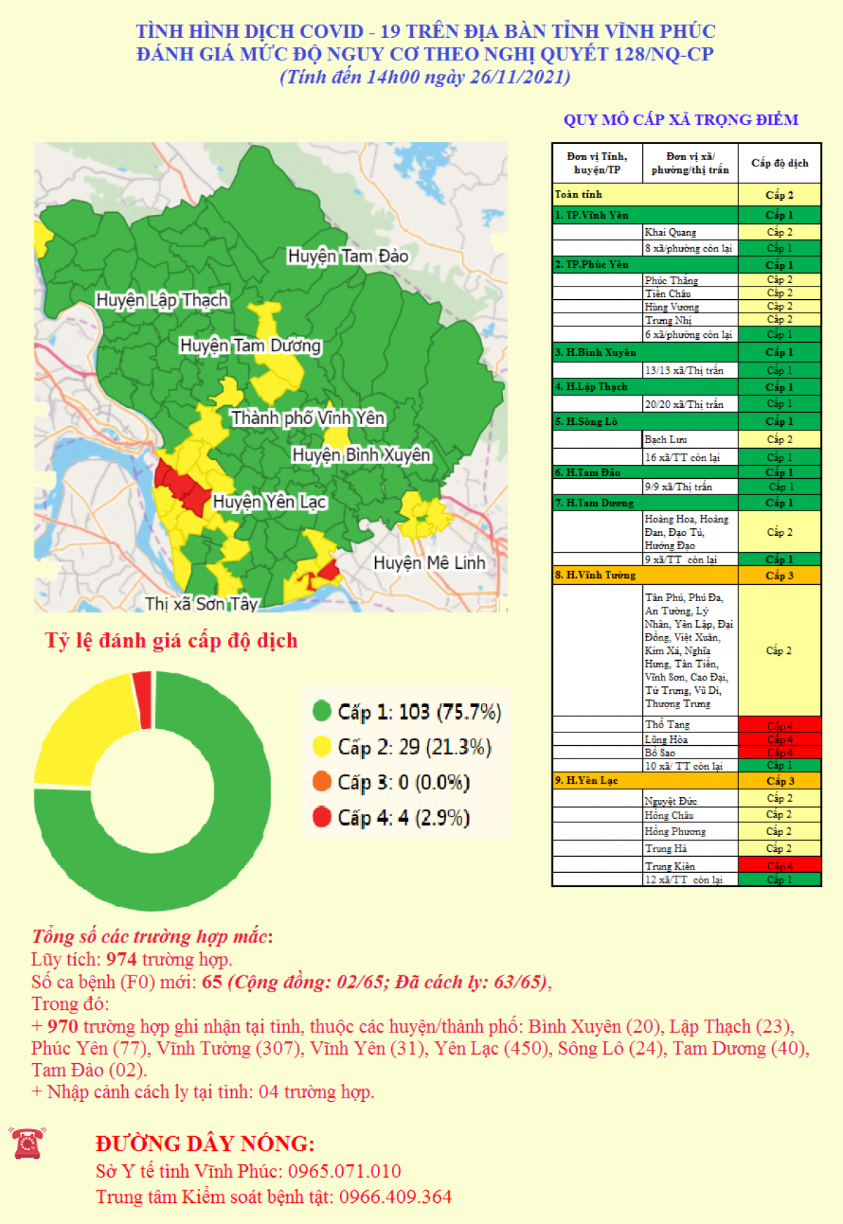 Ngày 27/11, trên Hệ thống Quốc gia quản lý ca bệnh COVID-19 cập nhật tại tỉnh Vĩnh Phúc có 104 ca mắc COVID-19 mới. Hiện toàn tỉnh Vĩnh Phúc đánh giá dịch ở cấp độ 2 - màu vàng. Với cấp huyện, thành phố có 2 địa phương ở cấp độ 3 - màu cam. Với xã, phường, thị trấn, có 4 đia phương ở cấp độ 4 - màu đỏ.
