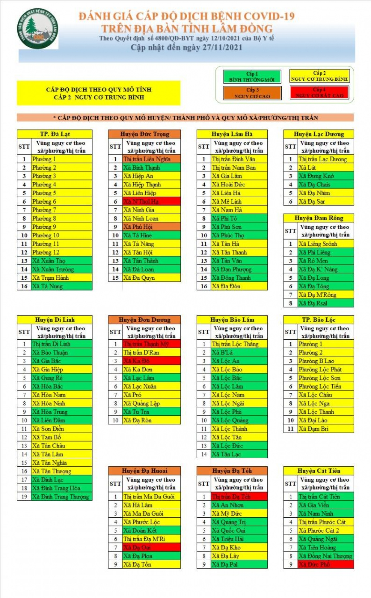 Ngày 27/11, toàn tỉnh Lâm Đồng ghi nhận 159 ca mắc COVID-19 mới. Cập nhật đánh giá cập độ dịch, toàn tỉnh ở màu vàng - cấp 2. Tại 5 huyện của tỉnh đánh giá 6 địa phương có cấp độ 4 - màu đỏ, nguy cơ dịch rất cao.