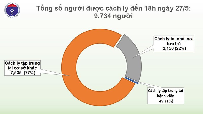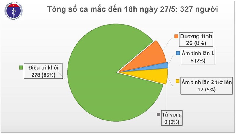 Theo Bộ Y tế, tính đến 18h chiều 27/5, cả nước có tổng cộng 327 ca mắc Covid-19. Số ca được điều trị khỏi là 278 người, trong đó, vừa có thêm 6 bệnh nhân được công bố khỏi bệnh và xuất viện.