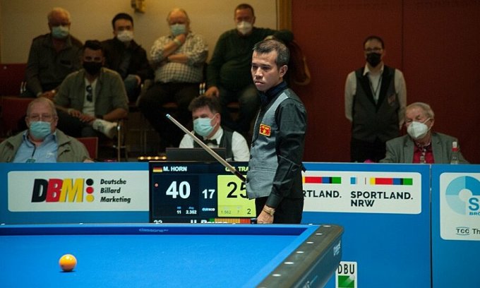 Cơ thủ Trần Quyết Chiến thi đấu tứ kết với Martin Horn tối 12/3 tại Viersen, Đức.
