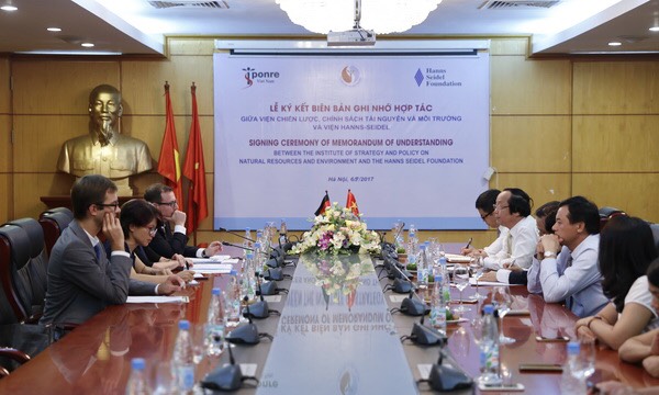 (ĐCSVN) - Chiều 6/9, tại Hà Nội, Viện Chiến lược, Chính sách tài nguyên và môi trường (Bộ Tài nguyên và Môi trường) và Viện Hanns Seidel, Cộng hòa Liên bang Đức đã tiến hành Lễ ký kết biên bản ghi nhớ hợp tác về đẩy mạnh hợp tác trong lĩnh vực tài nguyên môi trường, tăng trưởng xanh và phát triển bền vững.