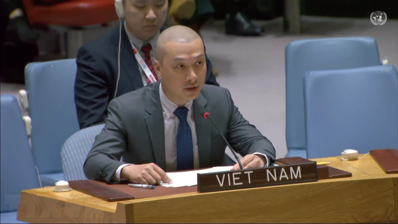 Tham tán công sứ Nguyễn Hoàng Nguyên, Phó Trưởng Phái đoàn Thường trực Việt Nam tại Liên hợp quốc, phát biểu tại phiên thảo luận. (Ảnh: TTXVN phát)