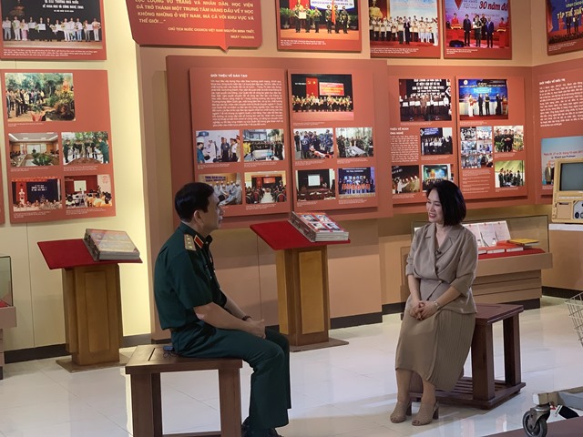 | Nhà báo Tạ Bích Loan trò chuyện với Bộ Trưởng Bộ Quốc Phòng trong chương trình. (Ảnh: Đài Truyền hình Việt Nam cung cấp) |
