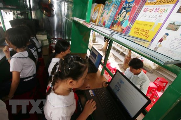 Các em học sinh trường Tiểu học Him Lam (thành phố Vị Thanh, tỉnh Hậu Giang) đọc sách, báo tại Xe thư viện lưu động đa phương tiện. (Ảnh: Duy Khương/TTXVN)
