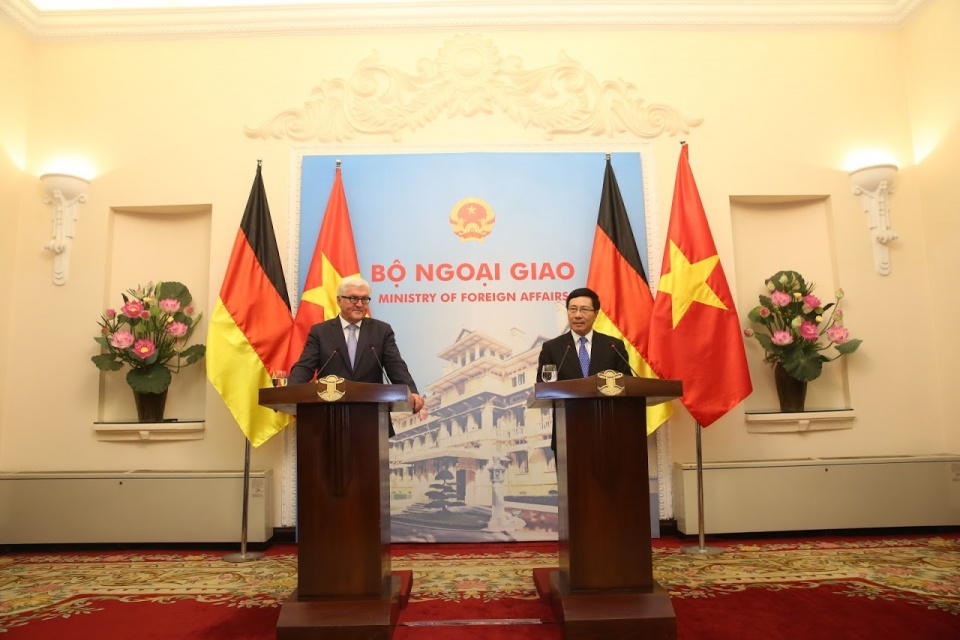 Phó Thủ tướng, Bộ trưởng Ngoại giao Phạm Bình Minh và Bộ trưởng Ngoại giao Đức Phờ-răng Van-tơ Xtai-mai-ơ nhất trí đánh giá, quan hệ Đối tác chiến lược Việt Nam – Đức thời gian qua phát triển năng động, hiệu quả. Hai bên thống nhất tăng cường trao đổi đoàn các cấp, đặc biệt là cấp cao; tiếp tục triển khai hiệu quả cơ chế họp Nhóm điều hành chiến lược giữa hai Bộ Ngoại giao; phối hợp triển khai tốt Kế hoạch hành động Việt Nam – Đức hàng năm. Hai bên nhất trí khuyến khích và tạo điều kiện thuận lợi cho xuất nhập khẩu hàng hóa, các doanh nghiệp Đức đầu tư vào Việt Nam, nhất là trong các lĩnh vực như công nghiệp chế tạo, công nghệ cao, năng lượng sạch và năng lượng tái tạo, cơ sở hạ tầng, tài chính - ngân hàng...; thúc đẩy sớm ký chính thức Hiệp định Thương mại tự do giữa Việt Nam và Liên minh Châu Âu (EU), tạo khuôn khổ mở rộng hợp tác thương mại, đầu tư giữa hai nước nhằm đạt mục tiêu nâng kim ngạch thương mại hai chiều lên 20 tỷ đô-la Mỹ vào năm 2020.