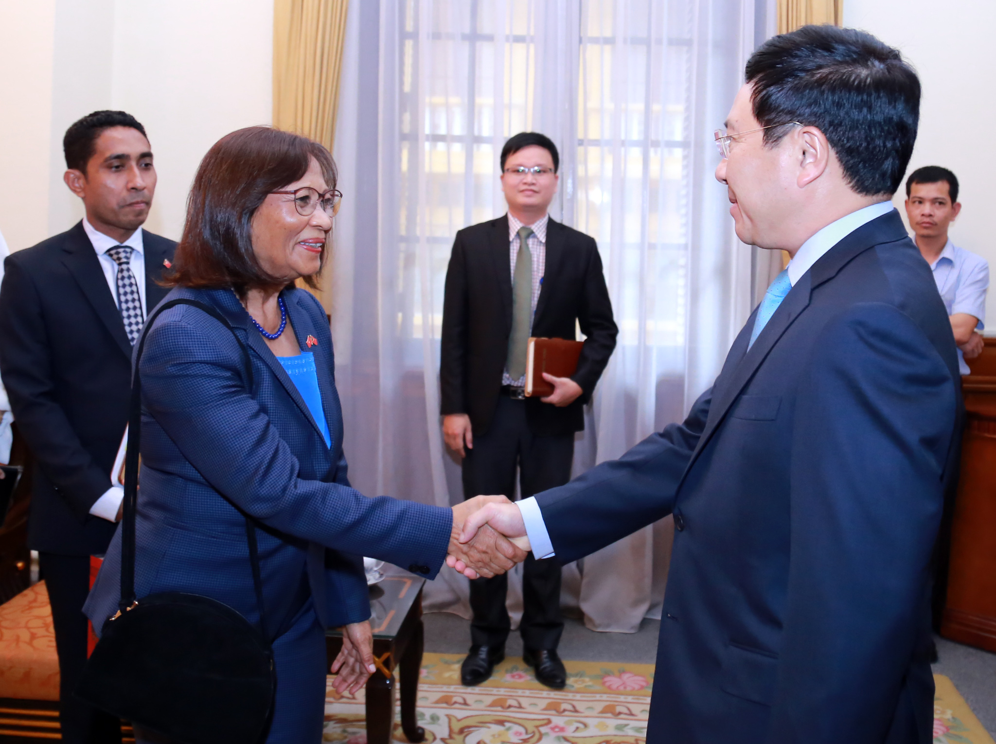 Phó Thủ tướng, Bộ trưởng Phạm Bình Minh đề nghị Bà Đại sứ tích cực kết nối các cơ quan đầu mối của hai nước để tạo điều kiện cho các nhà đầu tư Việt Nam đầu tư vào lĩnh vực tiềm năng như dầu khí và nông nghiệp tại Timo Lét-xtê; khẳng định Việt Nam luôn luôn hợp tác chặt chẽ với Timo Lét-xtê nhằm tiếp tục củng cố và tăng cường hơn nữa mối quan hệ tốt đẹp giữa hai nước, vì hoà bình, ổn định và thịnh vượng trong khu vực Đông Nam Á.