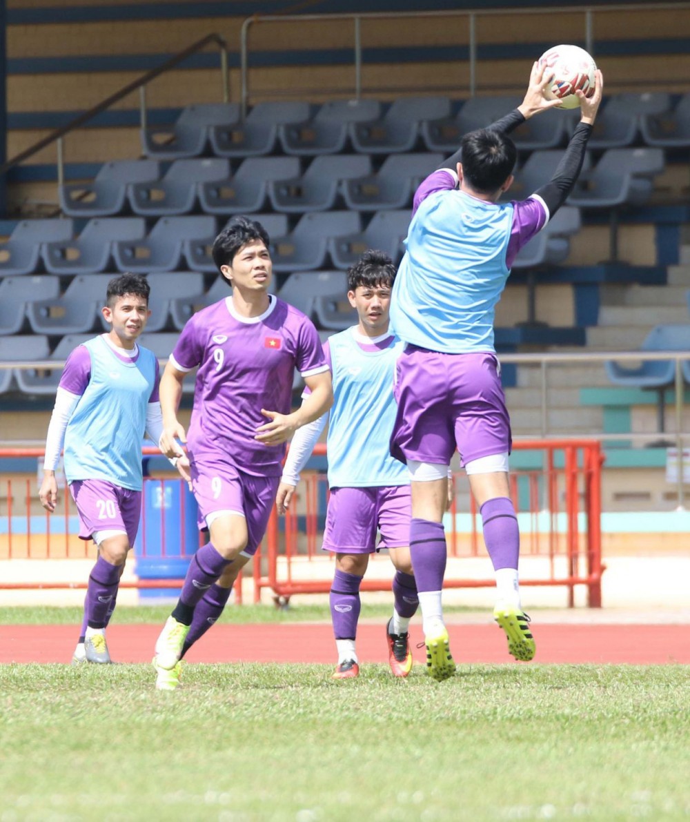 Buổi tập của các cầu thủ Việt Nam trước trận gặp Malaysia. Ảnh: VFF