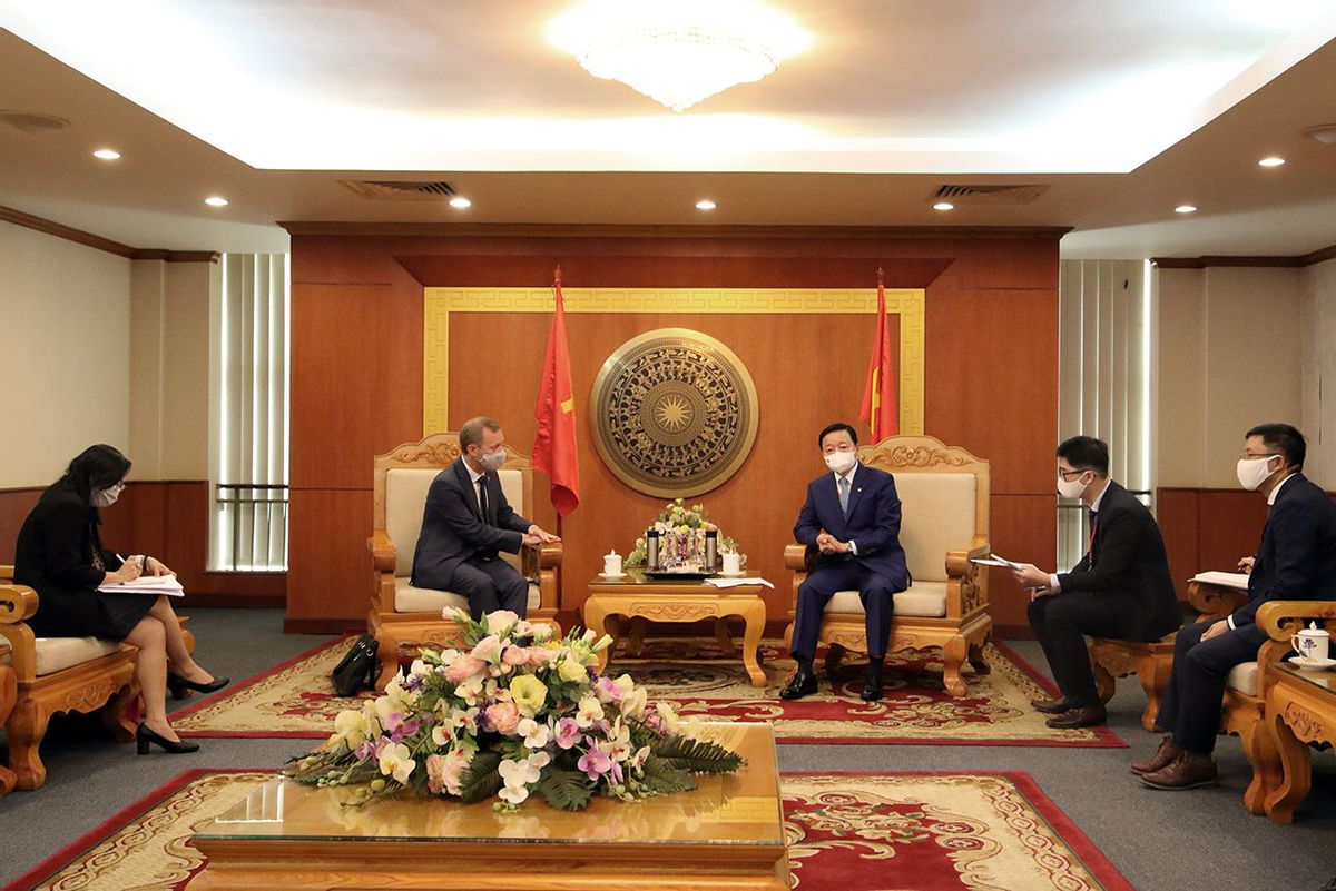 | Bộ trưởng Trần Hồng Hà tiếp và làm việc với ông Gareth Ward, Đại sứ Vương quốc Anh tại Việt Nam. Ảnh: KT |