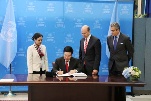 Ngày 22/9/2017, trong khuôn khổ Phiên họp cấp cao Đại hội đồng LHQ Khóa 72, Phó Thủ tướng, Bộ trưởng Ngoại giao Phạm Bình Minh đã ký Hiệp ước này. Việc sớm ký và phê chuẩn Hiệp ước đã thể hiện rõ chính sách nhất quán của Việt Nam vì hoà bình, ủng hộ việc giải trừ vũ khí hạt nhân trên toàn thế giới.