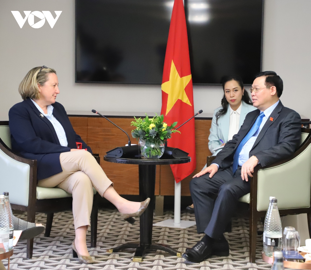 | Chủ tịch Quốc hội Vương Đình Huệ trao đổi với Bộ trưởng Bộ Thương mại quốc tế Anh Anne – Marie Trevelyan. Ảnh: VOV |