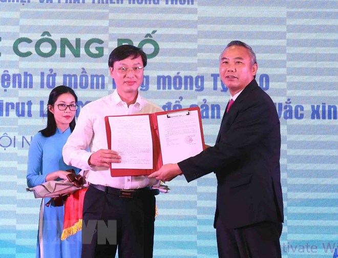 Thứ trưởng Bộ Nông nghiệp và Phát triển nông thôn Phùng Đức Tiến trao Quyết định công nhận giống virus lở mồm long móng type A cho Chi cục Thú y vùng VI. (Ảnh: Vũ Sinh/TTXVN)