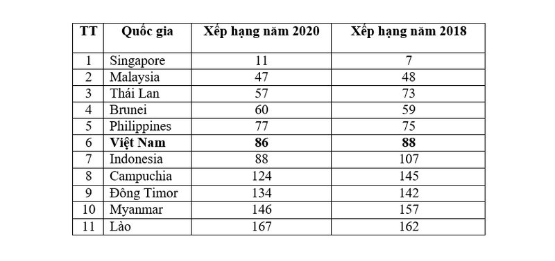Trong khu vực Đông Nam Á, Việt Nam xếp thứ 6 trong 11 nước, vẫn giữ nguyên vị trí như năm 2018; 05 nước có vị trí cao hơn Việt Nam vẫn là Singapore, Malaysia, Thái Lan, Bruinei và Philippines.