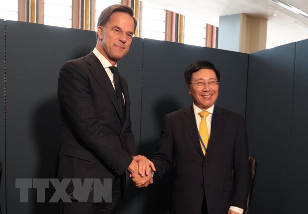 | Phó Thủ tướng Thường trực Phạm Bình Minh gặp Thủ tướng Hà Lan Mark Rutte. (Ảnh: TTXVN) |