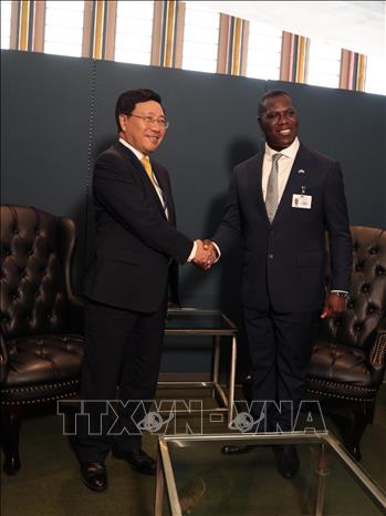 | Phó Thủ tướng Thường trực Phạm Bình Minh gặp Bộ trưởng Ngoại giao và Hợp tác quốc tế Sierra Leone David Francis. (Ảnh: TTXVN) |