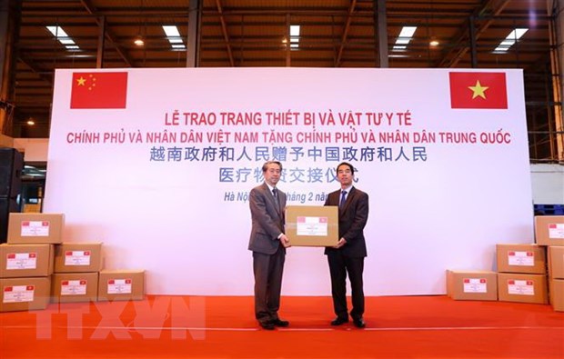 Tại buổi lễ, thay mặt phía Việt Nam, Thứ trưởng Bộ Ngoại giao Tô Anh Dũng đã trao cho Đại sứ Trung Quốc Hùng Ba số vật tư, trang thiết bị y tế gồm máy thở, quần áo sát khuẩn, găng tay và khẩu trang y tế với tổng trị giá 500.000 USD, là quà tặng của Đảng, Chính phủ và nhân dân Việt Nam tặng Đảng, Chính phủ và nhân dân Trung Quốc.