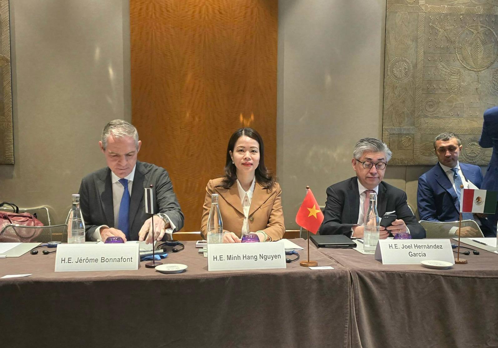 * Nhân dịp tham dự Hội nghị, Thứ trưởng Nguyễn Minh Hằng đã có cuộc gặp với Tổng Thư ký UNCTAD Rebecca Grynspan, Tổng Giám đốc WTO Ngozi Okonjo-Iweala, Giám đốc điều hành WEF Mirek Dusek, Bộ trưởng cao cấp phụ trách các vấn đề đặc biệt Campuchia Sok Siphana. Tại các cuộc gặp, các đối tác đánh giá cao sự điều hành của Chính phủ và thành tựu phát triển của Việt Nam, Tổng thư ký UNCTAD cho rằng Việt Nam là hình mẫu thành công về mở cửa và hội nhập kinh tế quốc tế; Tổng Giám đốc WTO cho rằng các chỉ số kinh tế vĩ mô của Việt Nam là “niềm mơ ước” của nhiều nền kinh tế; WEF nhấn mạnh Việt Nam là điểm đến đầu tư nhiều triển vọng của các tập đoàn thành viên. Các đối tác nhất trí thúc đẩy hợp tác, đồng hành cùng Việt Nam trên con đường phát triển./.