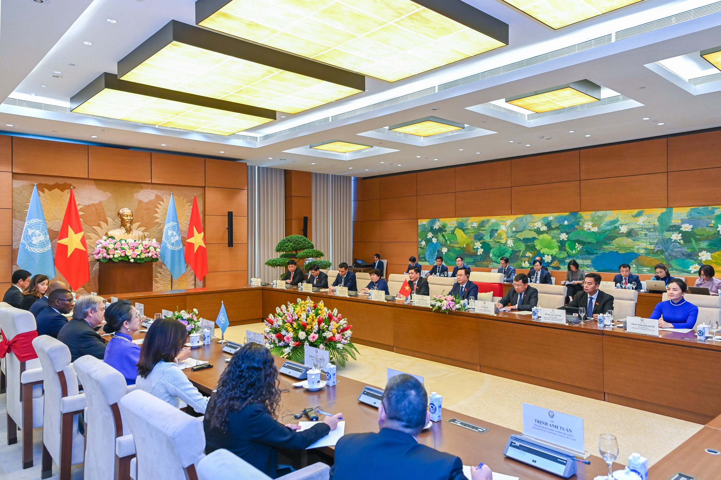 Tổng Thư ký Liên hợp quốc António Guterres bày tỏ vui mừng đến thăm Việt Nam và Nhà Quốc hội Việt Nam; bày tỏ khâm phục đất nước và con người Việt Nam trong thời kỳ chiến tranh cũng như xây dựng, phát triển đất nước; cho rằng Việt Nam là tấm gương để nhiều nước noi theo. Chia sẻ bản thân đã từng làm việc tại Quốc hội Bồ Đào Nha 18 năm, Tổng Thư ký Liên hợp quốc cho biết Quốc hội chính là nơi tập hợp được sự đóng góp của người dân vào quá trình xây dựng, phát triển đất nước; đánh giá cao hiệu quả hoạt động của Quốc hội Việt Nam.