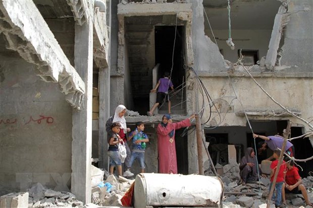 Người dân Palestine trở về bên những căn nhà đã bị phá hủy trong các cuộc không kích của máy bay Israel xuống thị trấn Beit Hanoun, Dải Gaza, khi lệnh ngừng bắn có hiệu lực, ngày 21/5. (Ảnh: THX/TTXVN)