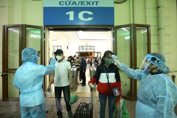 Kiểm tra thân nhiệt cho hành khách tại Ga Hà Nội. (Ảnh: TTXVN)