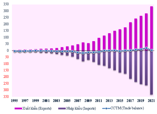 Tổng giá trị xuất khẩu, nhập khẩu, thặng dư thương mại của Việt Nam từ năm 1995 - 2021. Việt Nam trong top 30 nước xuất nhập khẩu lớn toàn cầu - Ảnh: WTO