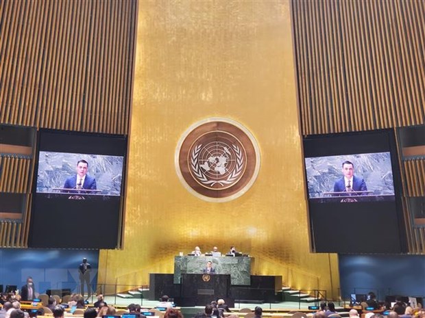 Đại sứ Đặng Hoàng Giang phát biểu tại một phiên họp của Đại Hội đồng Liên hợp quốc về tình hình Ukraine. (Ảnh: Khắc Hiếu/TTXVN)
