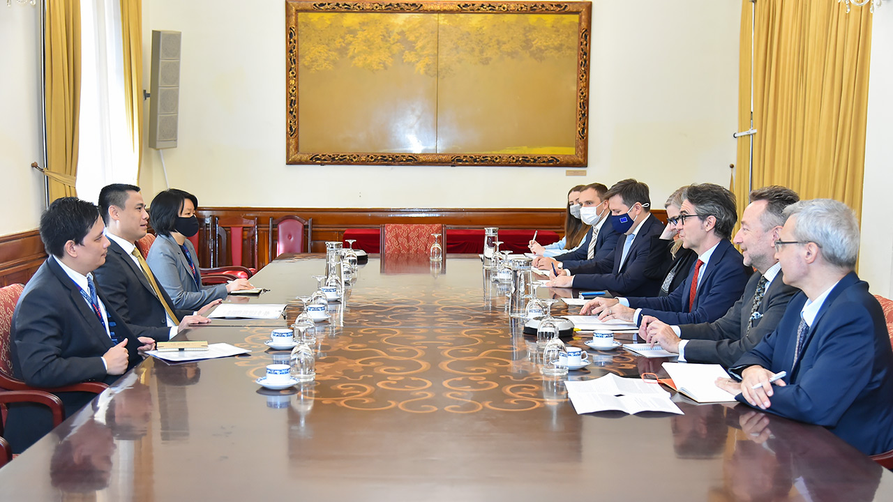 | Thứ trưởng Bộ Ngoại giao Đặng Hoàng Giang tiếp Đại sứ EU Giorgio Aliberti cùng Đại sứ các nước Pháp, Thụy Điển, Ba Lan và Séc để trao đổi về hợp tác song phương và một số vấn đề đa phương |