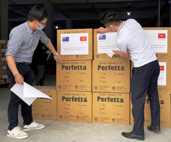 | Lô khẩu trang cứu trợ của Việt Nam được Australia hỗ trợ vận chuyển (Ảnh: PV) |