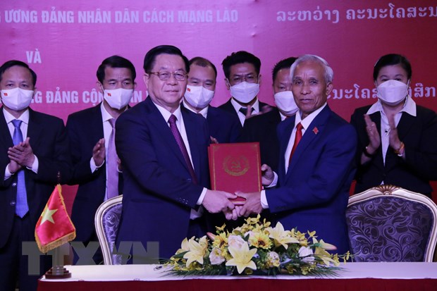 | Đồng chí Nguyễn Trọng Nghĩa, Bí thư Trung ương Đảng, Trưởng ban Tuyên giáo Trung ương Đảng Cộng sản Việt Nam và đồng chí Khamphan Pheuyavong, Bí thư Trung ương Đảng, Trưởng Ban Tuyên huấn Trung ương Đảng Nhân dân cách mạng Lào trao thỏa thuận hợp tác giữa hai bên. (Ảnh: Phạm Kiên/TTXVN) |