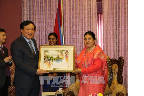 Về phần mình, Tổng thống Nepal chào mừng Chánh án Nguyễn Hòa Bình và đoàn đến thăm chính thức Nepal. Tổng thống Bydia Devi Bhandari chia sẻ rằng đối với Nepal, Việt Nam luôn là tấm gương quý giá, đã vượt qua những xung đột chiến tranh trong quá khứ, là bài học cho Nepal trong việc xây dựng và phát triển đất nước. Tổng thống chúc mừng những thành tựu mà Việt Nam đã đạt được trong thời gian qua. Ông cho rằng mối quan hệ giữa Việt Nam và Nepal đã đạt được nhiều thành tựu mới, tăng cường hiểu biết, chia sẻ với nhau và bày tỏ tin tưởng rằng quan hệ giữa hai nước sẽ được nâng cao và sâu sắc hơn nữa. Tổng thống Bydia Devi Bhandari cho rằng việc thiết lập đường hàng không trực tiếp giữa hai nước sẽ tạo điều kiện thuận lợi và khởi động nhiều hoạt động thương mại và đầu tư. Tổng thống Nepal đánh giá cao những thành công của Việt Nam trong việc tăng cường quan hệ với các nước trên thế giới nói chung, đặc biệt là với những nước láng giềng. Tổng thống nhờ Chánh án Nguyễn Hòa Bình chuyển lời mời tới Chủ tịch nước Trần Đại Quang sang thăm chính thức Nepal trong thời gian tới.