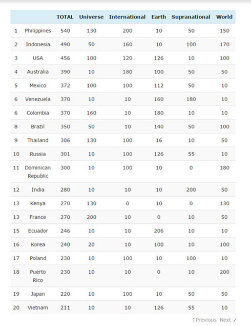 Ba vị trí dẫn đầu bảng xếp hạng lần lượt thuộc về các nước: Philippines, Indonesia và Mỹ. Theo Missosology, đây là lần đầu tiên có đến 7 quốc gia châu Á lọt vào top 20. Đây cũng là năm thứ 2 Phillipines giành vị trí dẫn đầu trên trang Missosology./.