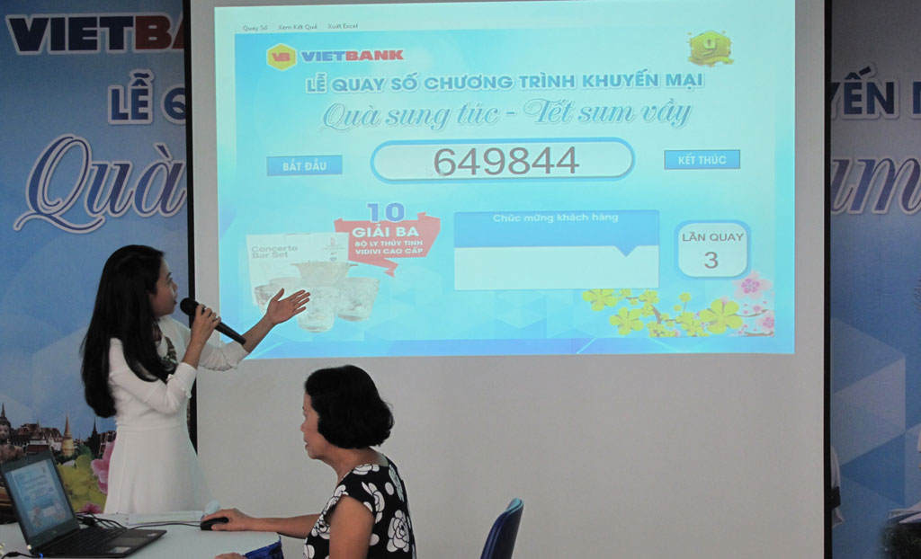 VietBank tiến hành quay số điện tử bằng cách nhấn phím chọn ngẫu nhiên vào máy tính đã nhập các mã số dự thưởng của khách hàng. Chủ nhân các giải thưởng được xác định ngẫu nhiên gồm: 1 giải đặc biệt: ôtô Honda City, 2 giải nhất: tour du lịch Thái Lan dành cho 2 người (5 ngày 4 đêm), 3 giải nhì: tour du lịch Singapore cho 1 người (3 ngày 2 đêm), 10 giải ba: bộ ly thủy tinh cao cấp.