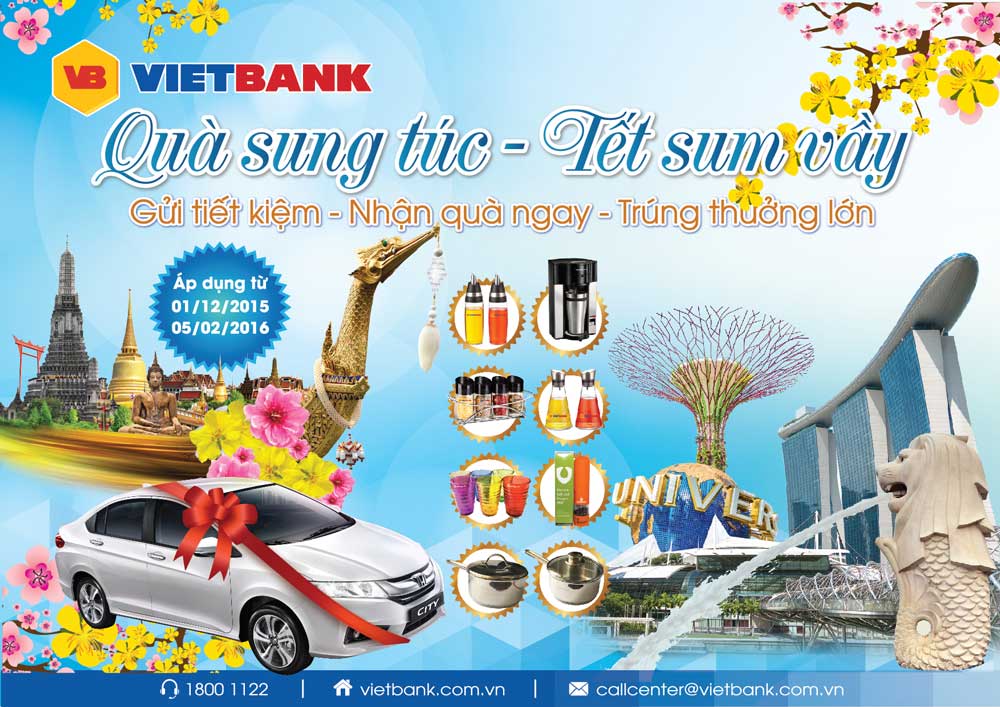 Từ 01/12/2015 đến 05/02/2016, Ngân hàng Việt Nam Thương Tín (VietBank) triển khai chương trình khuyến mại “Quà sung túc - Tết sum vầy” dành cho khách hàng gửi tiết kiệm VNĐ, USD kỳ hạn 1 tháng trở lên. Theo đó, Khách hàng gửi tiết kiệm sẽ được nhận quà tặng ngay lúc gửi với các mặt hàng gia dụng cao cấp và tham gia quay số trúng thưởng cuối chương trình với rất nhiều giải thưởng giá trị như: Ô tô Honda City, Tour du lịch Thái Lan, Singapore,….