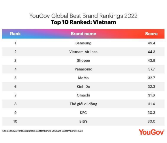 Thông qua các cuộc phỏng vấn với người tiêu dùng Việt Nam từ tháng 9/2021 đến tháng 9/2022, bảng xếp hạng này được lập ra dựa trên đánh giá của người tiêu dùng về 6 khía cạnh của thương hiệu là ấn tượng chung, chất lượng sản phẩm/dịch vụ, giá trị đồng tiền, sự hài lòng, mức độ giới thiệu và danh tiếng doanh nghiệp.