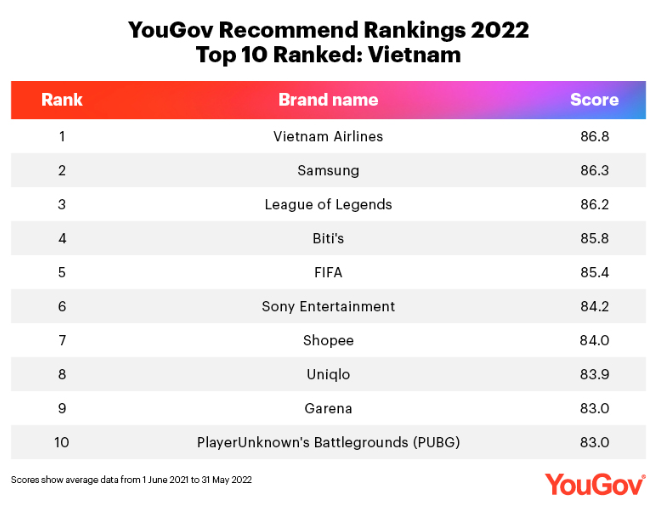 Yougov là tổ chức chuyên cung cấp kết quả khảo sát về đo lường nhận thức của công chúng về hàng nghìn thương hiệu thuộc đa dạng lĩnh vực. Đây là năm thứ tư liên tiếp Vietnam Airlines lọt vào danh sách uy tín này và là hãng hàng không duy nhất trong bảng xếp hạng.