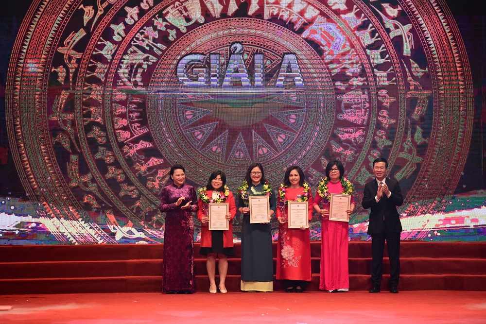 | Chủ tịch Quốc hội Nguyễn Thị Kim Ngân và Trưởng Ban Tuyên giáo Trung ương Võ Văn Thưởng trao giải A cho các tác giả (Ảnh: TH) |