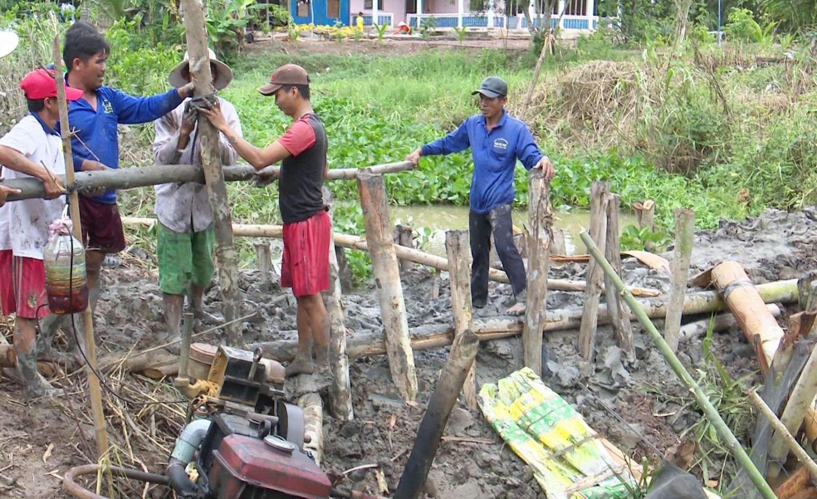 Người dân đang gia cố, đắp đập, đặt máy bơm nước để kịp thời cứu lúa