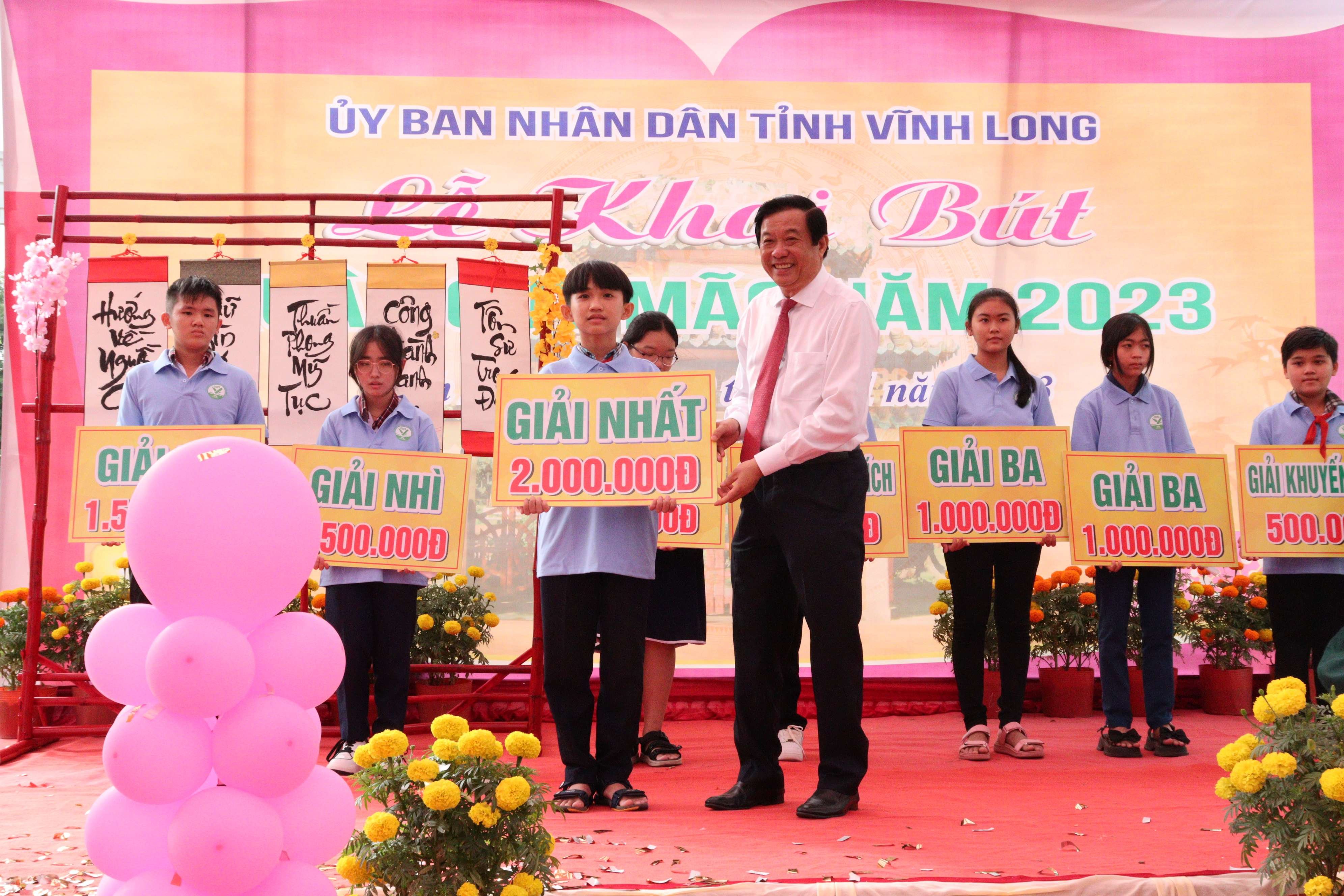 | Đồng chí Bùi Văn Nghiêm - Ủy viên Trung ương Đảng, Bí thư Tỉnh ủy Vĩnh Long trao giải cho các em học sinh (Ảnh: Phú Đức) |