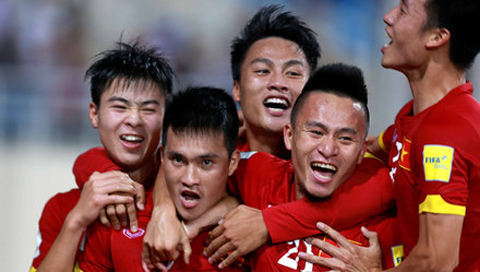 Niềm vui của các cầu thủ VN sau khi Công Vinh mở tỉ số. Ảnh: Nam Khánh
