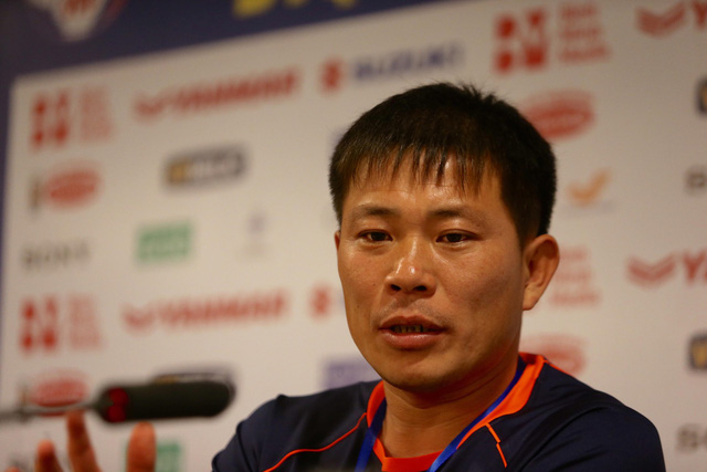 HLV Kim Yong Jun trả lời phỏng vấn trong cuộc họp báo sau trận- Ảnh: Nam Khánh