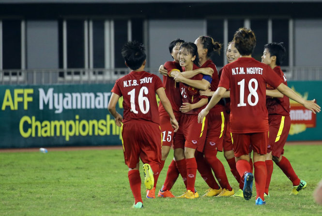 Đội tuyển nữ VN ăn mừng bàn thắng vào lưới Thái Lan. Ảnh: MFF