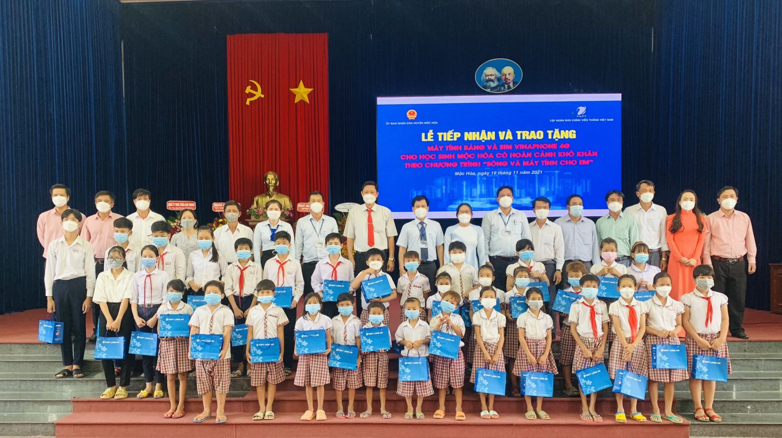 Tiếp nhận và trao tặng máy tính, sim Vinaphone 4G cho học sinh có hoàn cảnh khó khăn trên địa bàn huyện Mộc Hóa