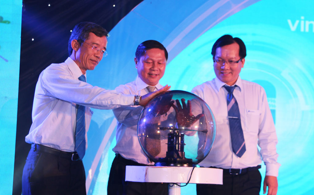 Phó Chủ tịch UBND tỉnh – Lê Tấn Dũng (người đứng giữa) chúc mừng VNPT Long An kỷ niệm 20 năm thành lập mạng Vinaphone
