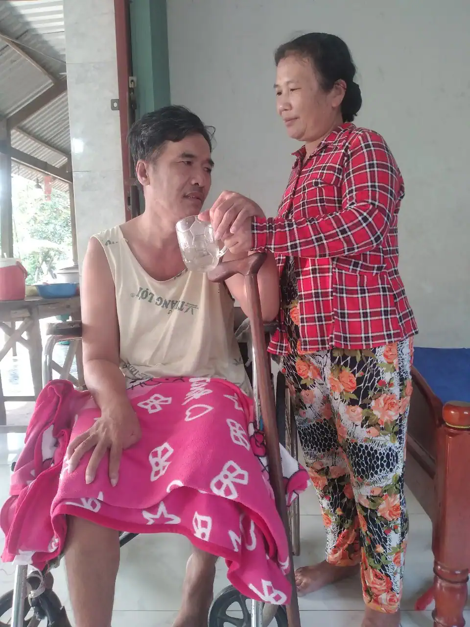 Sau biến cố, anh Tùng không thể đi lại được. Một mình chị Trang gánh gồng hết mọi việc trong nhà, từ chăm sóc chồng con đến làm kinh tế. Chị Trang nói: “Trước kia, chồng tôi khỏe mạnh, những công việc nặng nhọc anh đều gánh vác. Từ khi anh bệnh, ăn uống khó khăn, gầy đi trông thấy, tôi rất xót xa”. Thương chồng, chị Trang chăm chút từng bữa ăn. Chị còn thường xuyên mát xa để lưu thông máu huyết, chú ý vệ sinh để anh được thoải mái, sạch sẽ. Hiện tại, anh Trung đã có thể ngồi xe lăn di chuyển quanh nhà. Sau giờ làm, chị tranh thủ đưa anh đi dạo, sáng thì tắm nắng, chiều hóng mát. Ðối với chị Trang, phút giây được kề cận bên nhau, chia sẻ công việc làm ăn, nuôi dạy con cùng chồng là niềm hạnh phúc không dễ gì có được và chị rất trân quý.