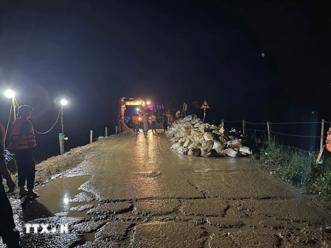 Thời điểm 22 giờ (10/9), hàng trăm người dân và các lực lượng chức năng vẫn đang khẩn trương chuyển các bao đất tới vị trí vỡ đê. Nhiều xe tải chở đá và máy xúc cũng đã được huy động tới hiện trường để ứng phó với sự cố.