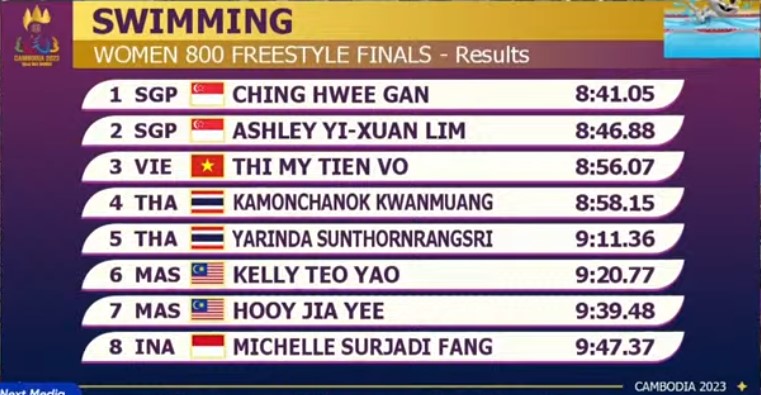 Tối ngày 11/5, chung kết nội dung bơi 800m tự do nữ SEA Games 32 diễn ra với sự góp mặt của kình ngư quê Long An – Võ Thị Mỹ Tiên. Đây cũng là một trong số những cự li sở trường của Mỹ Tiên. Tuy nhiên, trong lượt bơi chung kết, Mỹ Tiên phải đụng độ với những kình ngư rất mạnh đến từ Singapore.